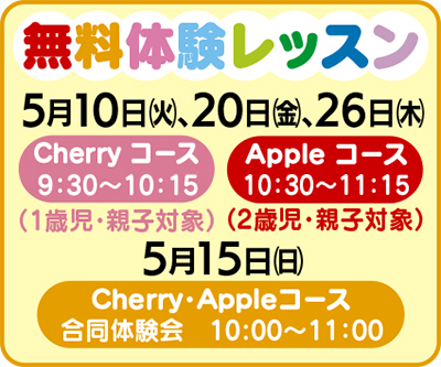 同所では5月15日に1歳児・2歳児対象の無料合同体験レッスンを実施。希望者は早めの予約をおすすめする。