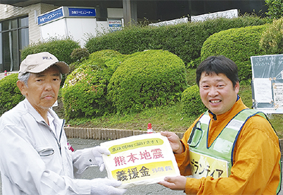 ボランティアセンターで登録後、派遣されたのは全壊した個人宅。二次被害を防ぐため、散乱したブロック塀を約5時間かけて撤去した。また、店先で募っていた義援金1万3451円を益城町役場に届けたほか、店で販売する米の生産農家である南阿蘇村の中村龍子さんを訪問。中村さんは幸い無事だったが、今年は稲作ができない状況だという。