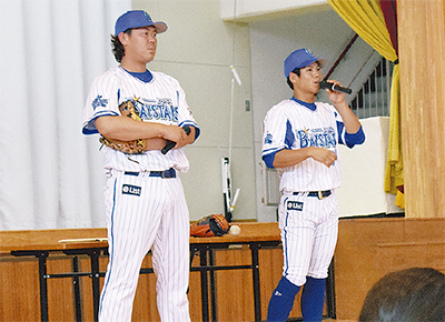 横浜DeNAベイスターズの山口俊選手と桑原将志選手が24日、東山田小学校(菅原惠市校長)で訪問授業を行った。