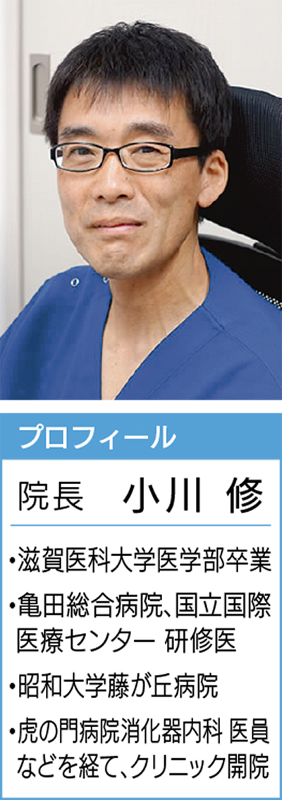 口や鼻、肛門からカメラを入れ消化器官にできた腫瘍やポリープなどを早期発見、切除する内視鏡検査。小川院長は昭和大学藤が丘病院や虎の門病院消化器内科医員として内視鏡検査・治療を中心に20年程の経験を持ち、約2万件の症例実績がある。「検査方法なども日々、進歩しています。患者様に最も適した医療を提案したい。早期発見、早期治療が健康への第一歩です」と小川院長。