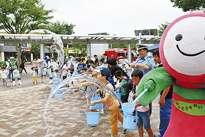 8月10日は「道の日」。この日にちなんで同日、都筑土木事務所はセンター南駅前広場で打ち水=写真=などの記念イベントを開催し、家族連れが多数参加した。