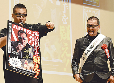 大使就任に伴い、蝶野さんとものまね芸人・蛾野(がの)正洋さんを起用した詐欺撲滅ポスターを披露する場面も。蛾野さんのものまねに蝶野さんは「ニセモノに注意を」と呼びかけた。