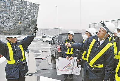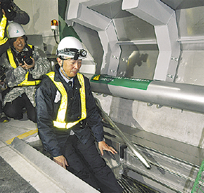 そのほか、発災の被害拡大を防止する水噴霧設備や泡消火栓のデモンストレーションも実施。さらに、高速道路下の避難通路につながるすべり台体験も行われた=写真右。最終目的地の横浜港北JCTでは航空写真のパネルを利用し、寺山局長が北線の接続を説明。「20年の東京五輪までに市と共同し、北西線(港北JCT―東名高速・青葉IC)の整備を目指す」と話した。