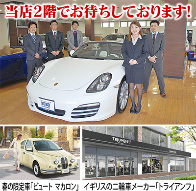 県内で光岡車を手に入れられるのは同店の2階のみ。色鮮やかな春の限定車「ビュート マカロン」が、ひときわ目を引く。また正規ディーラーや中古車「ブブ」事業を展開する同社では、高品質なヨーロッパ車を豊富に取り扱っており、ありとあらゆるブランドの車を一度に楽しみながら選べるのも魅力だ。さらに1階にはイギリスの二輪車メーカー「トライアンフ」ショールームもグランドオープン。1ブランドでは国内最大級の面積を誇る。