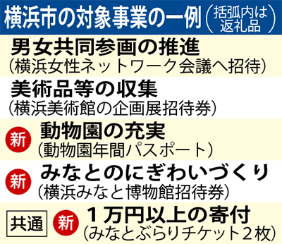 これに歯止めをかけようと市は17年度から同制度の見直しに着手。1万円以上の寄付に対して横浜駅からベイエリアの市営バス・地下鉄一日乗車券「みなとぶらりチケット」2枚を用意するほか、「動物園の充実」など対象事業を9種増やして「動物園年間パスポート」などを提供する。