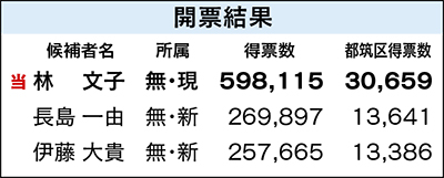 任期満了に伴う横浜市長選挙が7月30日に投開票され、無所属で現職の林文子氏(71)=自民・公明推薦=が約60万票を得て、いずれも無所属で新人の元衆議院議員・長島一由氏(50)と元市議・伊藤大貴氏(39)に30万票以上の大差を付けて3選を決めた。投票率は37・21%で前回を約8ポイント上回った。