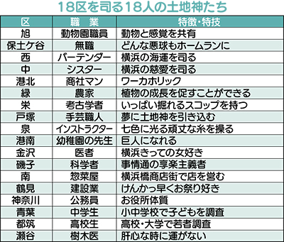 分区した歴史のある青葉と都筑は、分区元である緑と港北とともに家族として描かれるなど、各区の成り立ちを踏まえ血縁関係まで設定している。神々がナンバーワンを巡り戦うストーリーは、地元愛の強いハマっ子の気質に影響を受けたという。「横浜市民は『おらが村』という意識があったり、いい意味で見栄っ張り。でもその気質が横浜を大きくしてきたと思う」