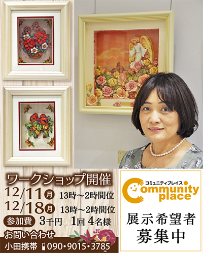 アメリカ在住中にシャドウボックスに出会い、帰国後に「3D Art Circle YUCCA」を設立・主宰する小田有香氏と門下の講師4名の作品展。シャドウボックスとは、複数枚の絵をパーツ毎にカットし、丸みや表情をつけながら重ねて2次元の絵に命を吹き込み、よりリアルな3次元の世界を創り出す工芸。今回は22点を展示、12月8日(金)の作品入れ替えでは前回展示を行った前田英郎氏の絵を使って3Dにした作品も登場する。「様々な角度から眺め、遠近のバランスに注目してほしい」と小田氏。12月11日(月)、18日(月)にはワークショックも開催される。