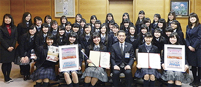 中央大学附属横浜中学校・高等学校バトン部は1月29日、昨年12月に幕張メッセで開催された全国大会に出場したことを受け、畑澤健一都筑区長に表敬訪問を行った。