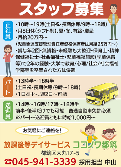 今年7月に増設を予定している「放課後デイサービス ココノワ都筑」(都筑区大丸)は現在、より多くの子どもをサポートするため、正社員・パート・送迎員を募集している。