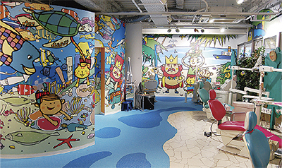 院内には絵本コーナーやボールプールなどのキッズスペース、壁いっぱいに描かれたキャラクターなど、子ども心がいっぱい。これらは「親子で学んで、楽しく通える『子どものための歯医者さん』を目指します」という久保倉弘孝理事長の想いを具現化したもの。