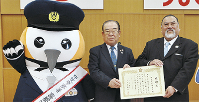 都筑・緑遊技場組合(奥田武夫組合長=今号人物風土記で紹介)は3月29日、都筑防犯協会(岩嶋伸幸会長)に着ぐるみを寄贈し、岩嶋会長から感謝状が授与された。