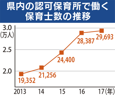 厚生労働省によると、17年6月現在、民間保育士の平均賃金は約22万円。これは全産業平均の約30万円より8万円ほど低い。市内の認可保育園の園長は「慢性的な人手不足。『命を預かる責任に対して処遇が低い』との理由で辞めていく人が多い」と現状を話す。