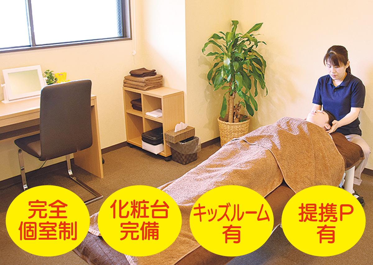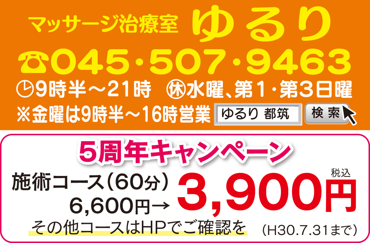 都筑ふれあいの丘駅から徒歩5分の「マッサージ治療室ゆるり」は、施術経験10年以上の牧野さん夫婦が体の痛みやコリを和らげてくれる癒しの空間。主婦や会社員など多くのリピーターが通う完全個室制治療室だ。