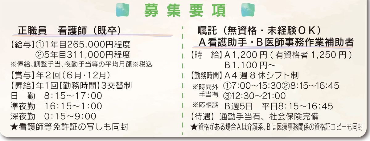 診断書の作成、検査のオーダー変更、症例登録等の入力業務、患者対応と医師の指示のもと業務を行う。報連相を密にし、協力体制が整っているので、子育て中や病院勤務が初めての人も安心だ。