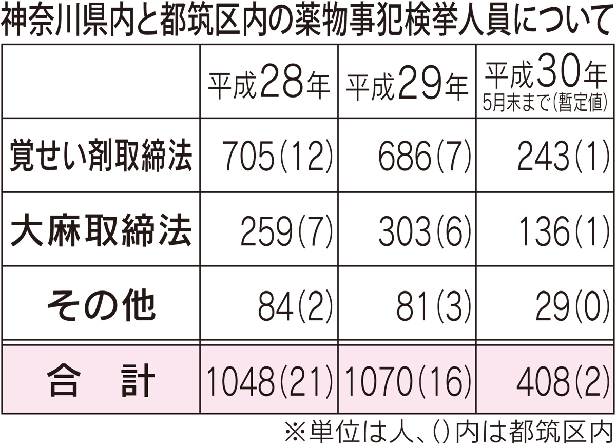 都筑区内では16年21人、17年は16人と微減。今年は覚醒剤と大麻で各1人の計2人が検挙されている状況だ。