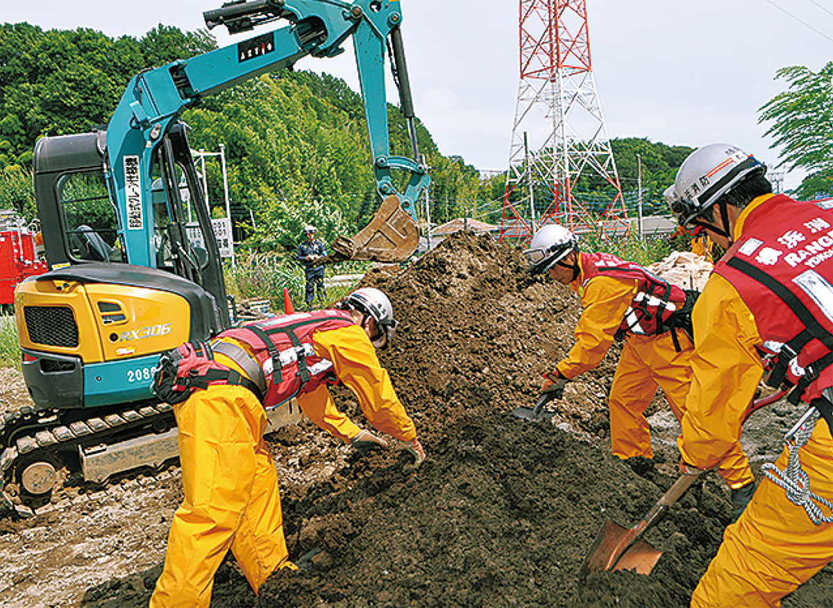 ゲリラ豪雨により宅地に土砂が流出し、行方不明になった人を助ける想定で訓練が行われた。人力で救助するには時間がかかる現場に、掘削機やショベルカーを出動させ、迅速に土砂を掘り起し、救助にあたった=写真。