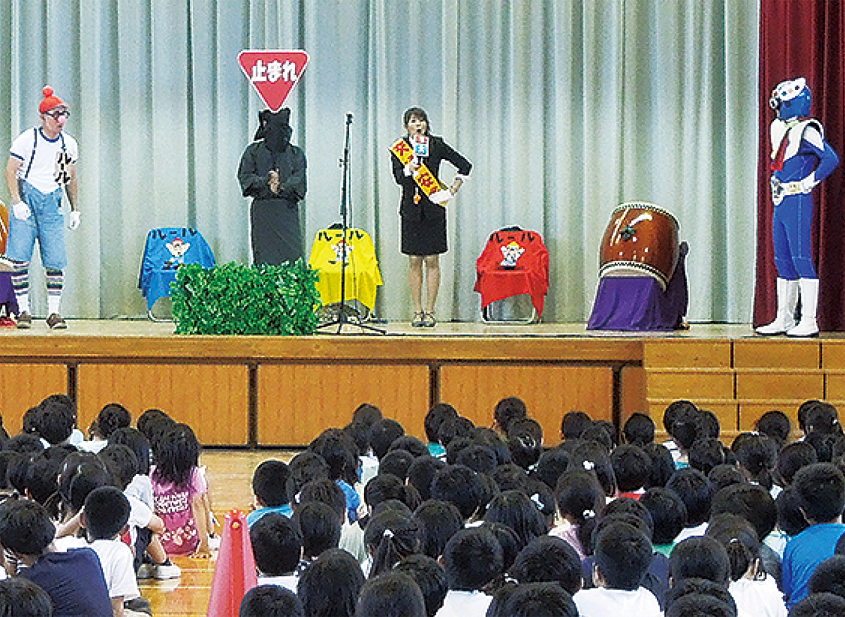 初めに、横浜F・マリノスのキャラクター「マリノスケ」と、公式チアリーディングチーム「トリコロールマーメイズ」が登場。同署員と一緒に、「手を上げて右・左・右」の安全確認を実演し、横断歩道の正しい渡り方を指導した。その後、日吉自動車学校の職員らで構成された「劇団ルール」が、「交通安全は1人1人が守るもの」をテーマとした寸劇を披露し、児童は楽しみながら交通ルールを学んだ。