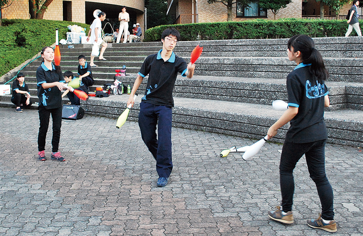 飲食物の模擬店のほか、射的ゲーム、輪投げなどで子どもが楽しむ姿が見られた。また、市ケ尾高校ジャグリング部の演技=写真=や茅ケ崎中吹奏楽部の演奏なども披露された。