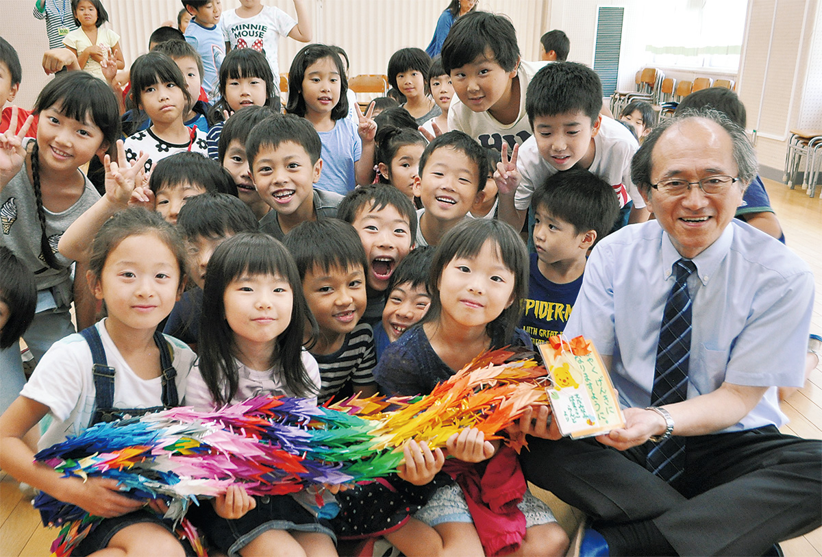 最後に、北部病院の小児病棟に入院する子どもの回復を願い、同校児童が折った千羽鶴を梅田教授に贈呈=写真。男子児童(4年)は「早く元気になってね」と話した。