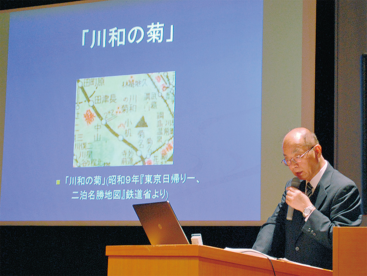 当日は、地域住民ら約170人が参加。郷土史家の相澤雅雄さんが講師を務め、明治維新以後から都筑郡川和村などが横浜市に編入され、港北区が誕生するまでの区史を紹介した。当時、川和には都筑郡役所や警察署があり行政の中心地として栄え、また菊の名所として全国から人が訪れていた様子を、大正時代の地図や絵はがきなどから紐解いた=写真。