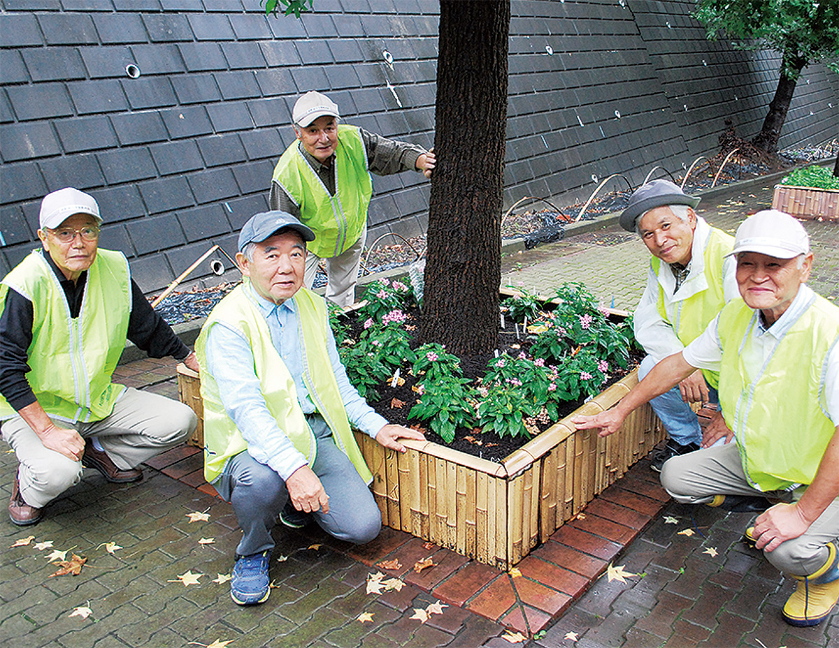 草刈りが終わり緑道がきれいになると、街路樹の根が地上まで這い上がり、歩行者がつまづく危険性が出てきた。そこで同事務所から土と花の提供を受け、根の上から土をかぶせて花壇を作ることにした。見た目の美しさと、竹林の多い都筑区の特徴を生かし、花壇は竹で囲うことに。区内に住む米山さんの知人の竹やぶから20本を伐採・加工し、丁寧に並べていった。夏休み中には近隣の子どもと一緒に約240株の花を植えるなどし、13カ所の花壇を完成させた。「1つ完成するごとにまちの人が喜んでくれた。作り手の励みになった」とメンバーは振り返る。