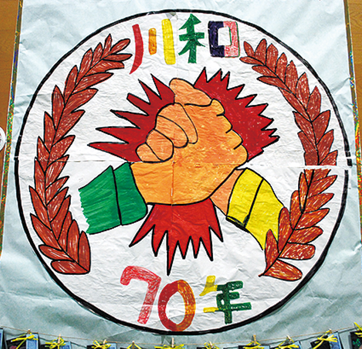 同校は昨年、70周年を記念して全校生徒から「ロゴマーク」を公募。地域の人たちの「協力」と学校の友達などの「友情」をテーマにしたという、門田詩音さん(6年)のデザインが選ばれた。