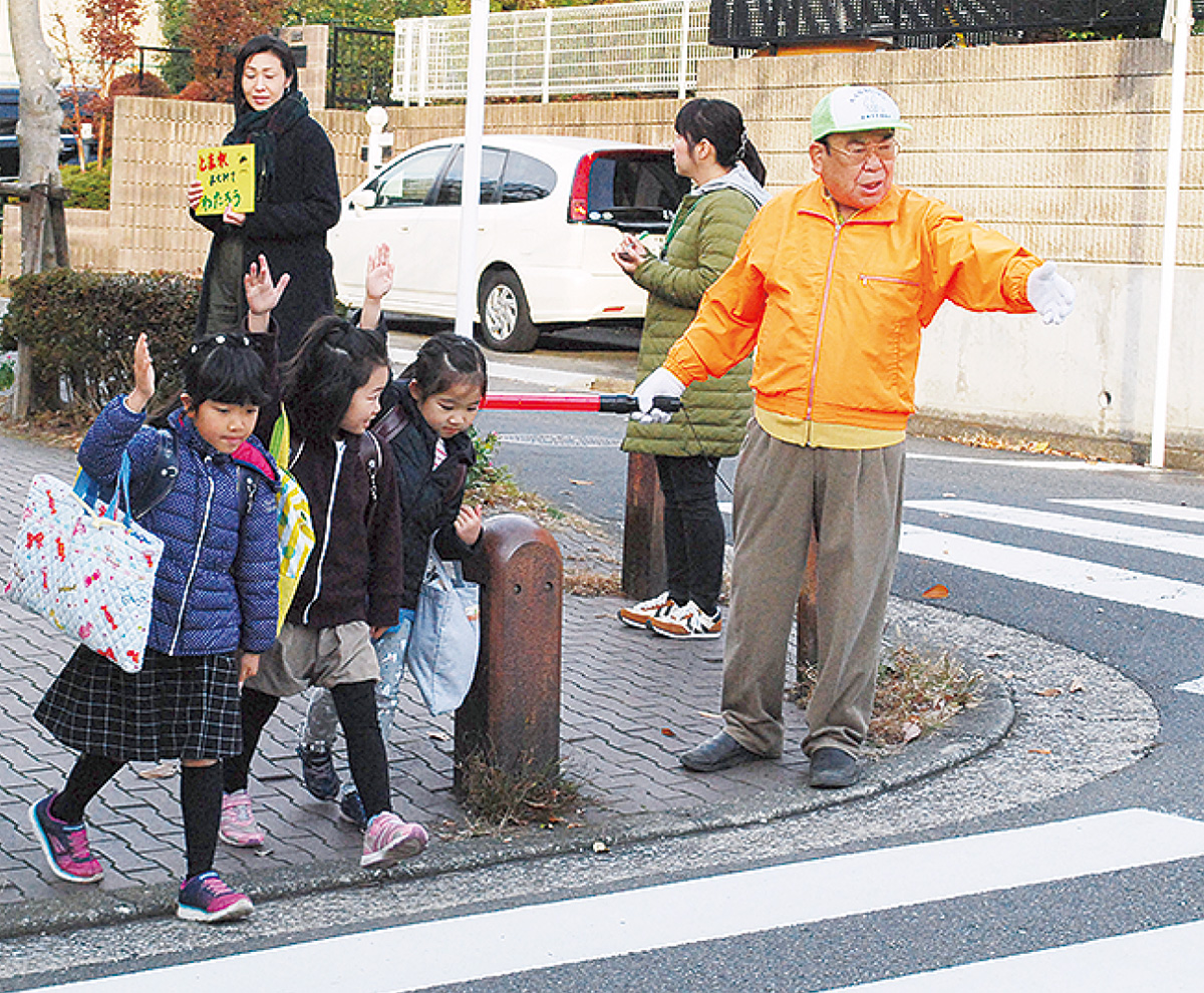 同エリアは交通量が多く、住民から児童が登校する際に危険との声が上がり、自治会員らが夏頃から見守り活動を実施。当日は横断歩道前で車を止め、減速を呼びかけるチラシを配布し、児童らを誘導した=写真。