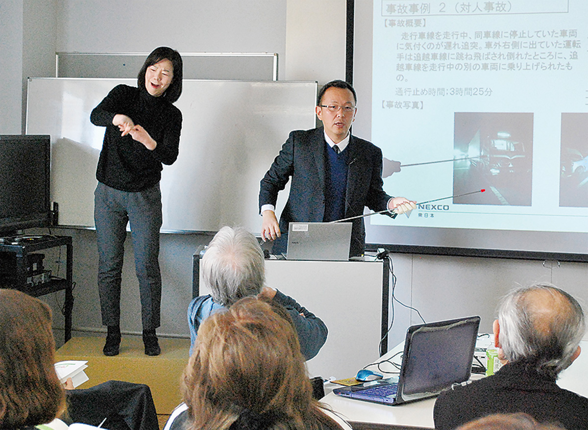 過去に高速道路を利用し、藤本代表が旅行にいった際、衝突事故に遭い手話通訳を頼めずに困ったことなどから同講演会を企画。東日本高速道路(株)関東支社の前田信さんが高速道路での事故事例や対処法などを説明。また、神奈川県警警察本部の上原慎也さんは空き巣や万引きなどの防犯対策について解説した。