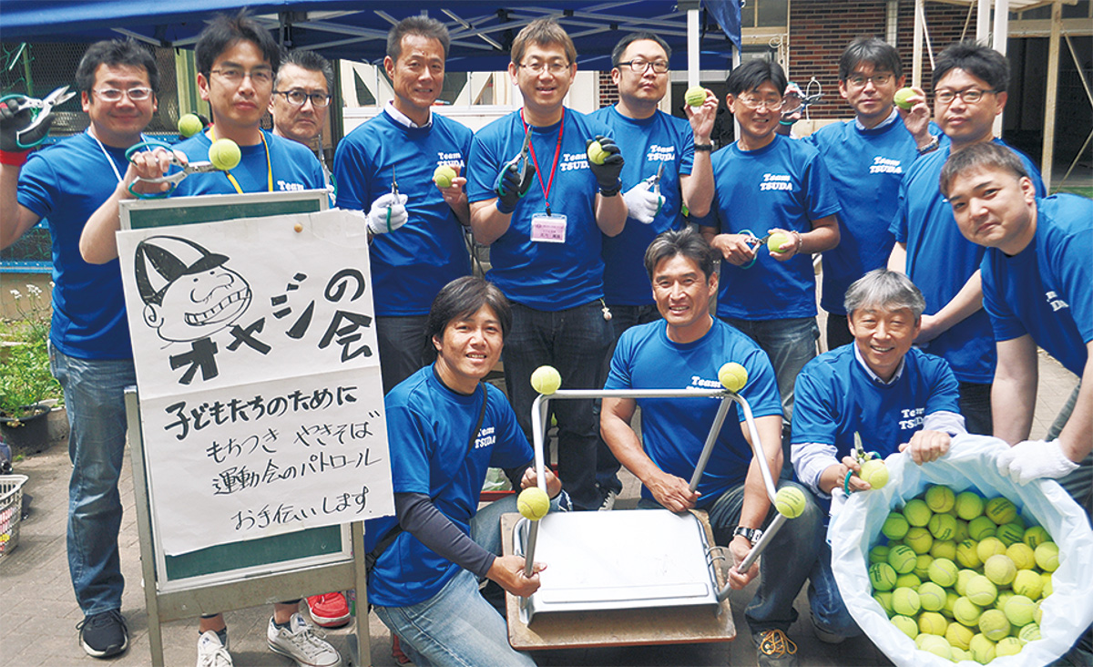 都田小学校(鳴本敏子校長)で5月18日、土曜参観が行われた。授業の様子を見にきた保護者で賑わう校内でひときわ目を引いたのは、青いTシャツを着てテニスボールに穴を空ける男性。都田小学校「おやじの会」のメンバーだ。