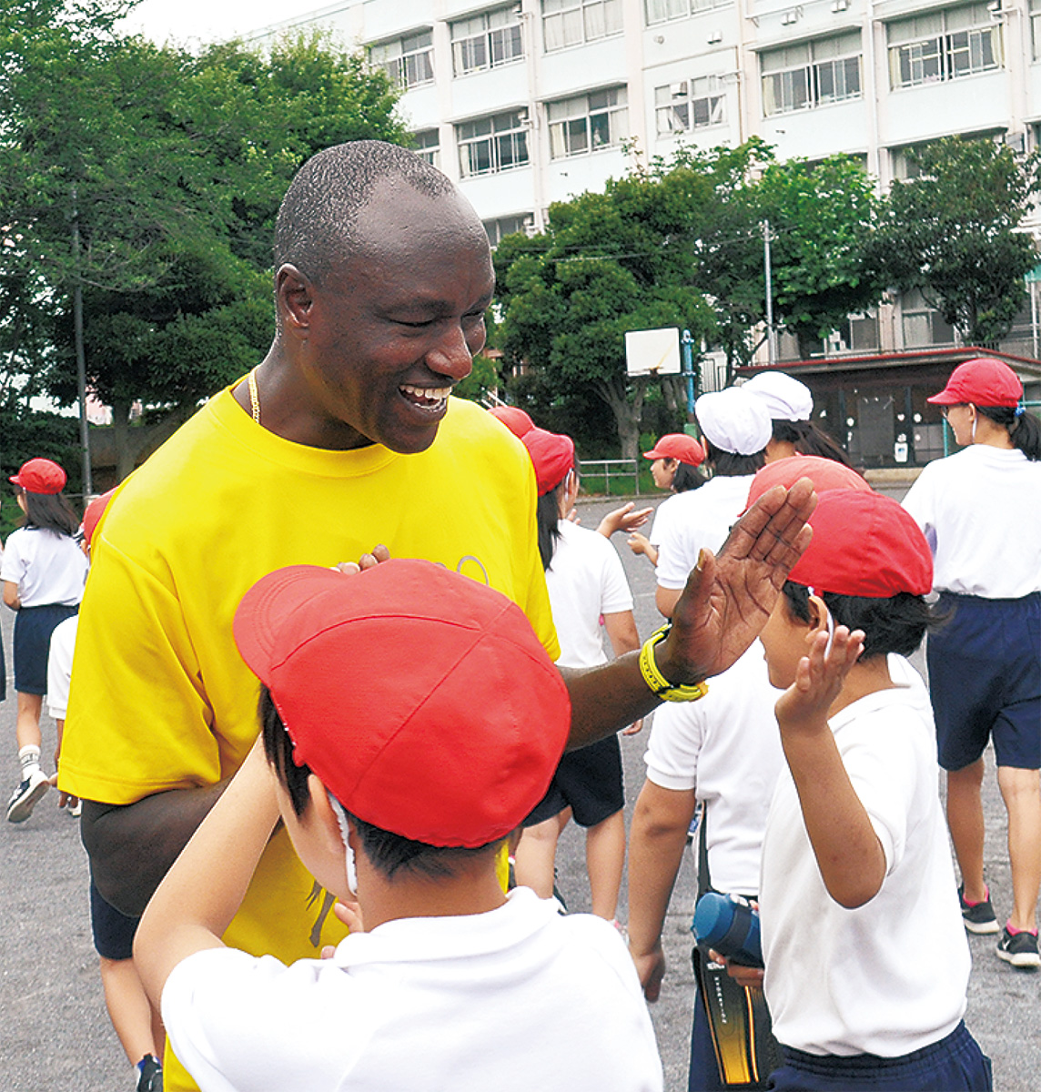 当日は全校生徒約510人に来日時のことや正しい走り方などについて講演を行ったあと、5、6年生に向けて走り方教室を行った。指導を受けた6年生の男児児童は「教えてもらった通り、腕を大きく振って、運動会のリレーの選手になりたい」と話した。ワイナイナ選手は「できなくても気にしない。まずはチャレンジ。そのあとに練習を積み重ねることが大切」と児童にメッセージを送った。