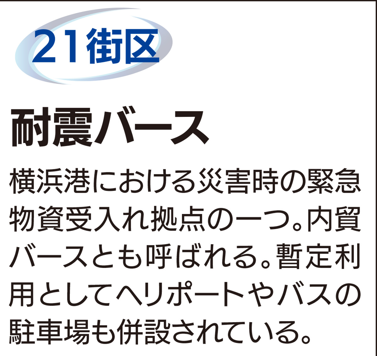 バースとは船が港に接岸するための係留施設のこと。その中でも耐震性を強化したのが耐震バース。みなとみらい21地区の開発事業が着工する前、1982年の時点で当時の港湾計画に想定が盛り込まれていた。