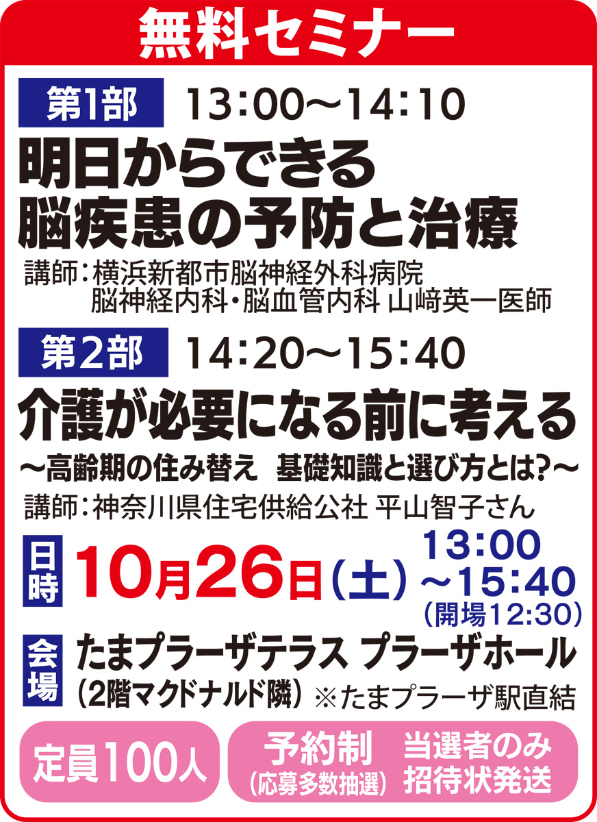 寝たきりや認知症の主な原因となる脳卒中など「脳疾患」の怖さを正しく知り、予防と治療法を専門医に学ぶ無料セミナーが10月26日(土)、たまプラーザテラスで開かれる。主催は三井不動産リアルティ(株)。