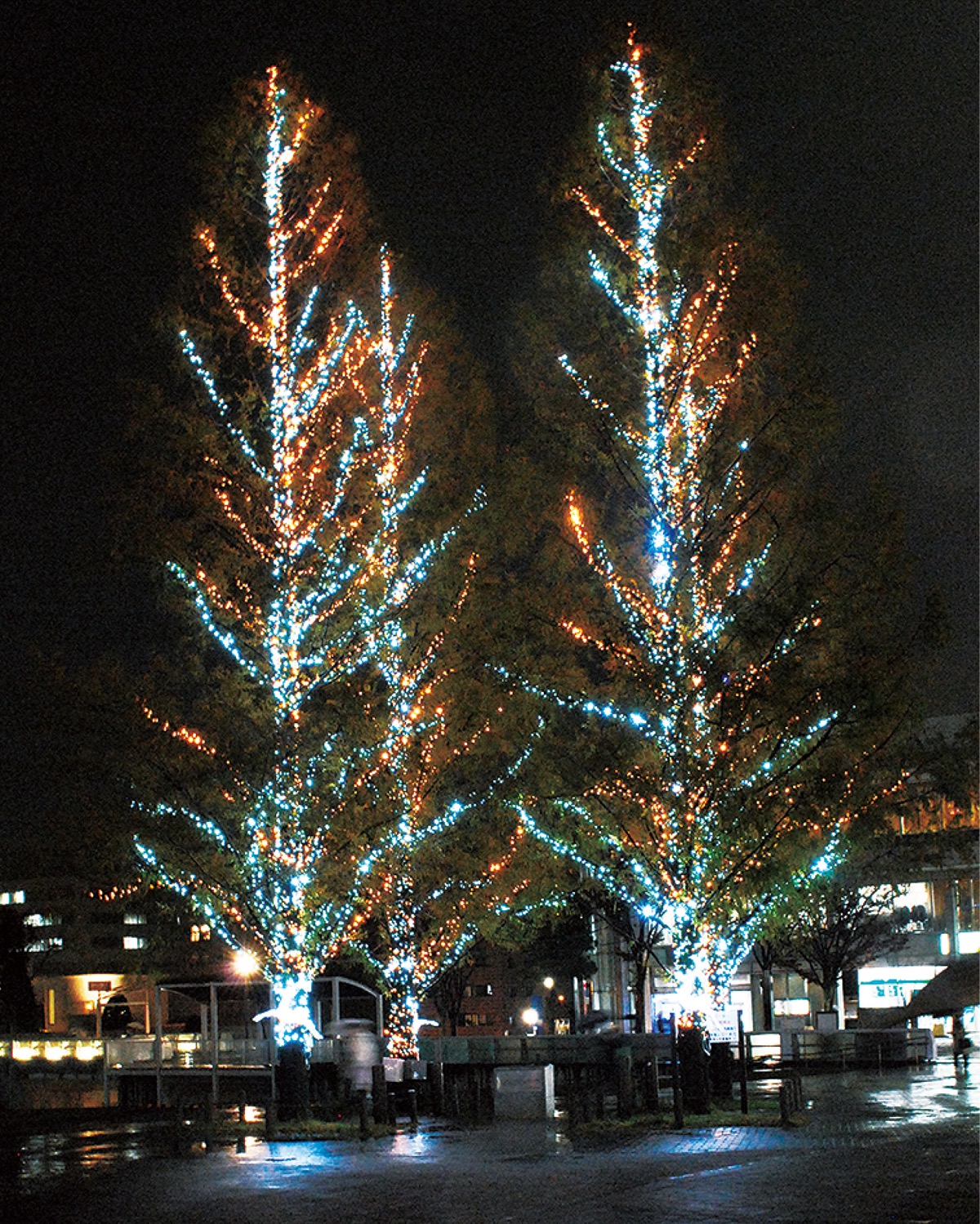 当日は地元団体がダンスを披露し、会場を盛り上げた。点灯式に先立ち、主催者を代表し、金子会長が「温かみのあるイルミネーションを楽しんでほしい」と挨拶。その後、カウントダウンが行われ、センター南駅前の木がライトアップされた=写真。今年はトナカイもあしらわれている。20年2月27日まで点灯。