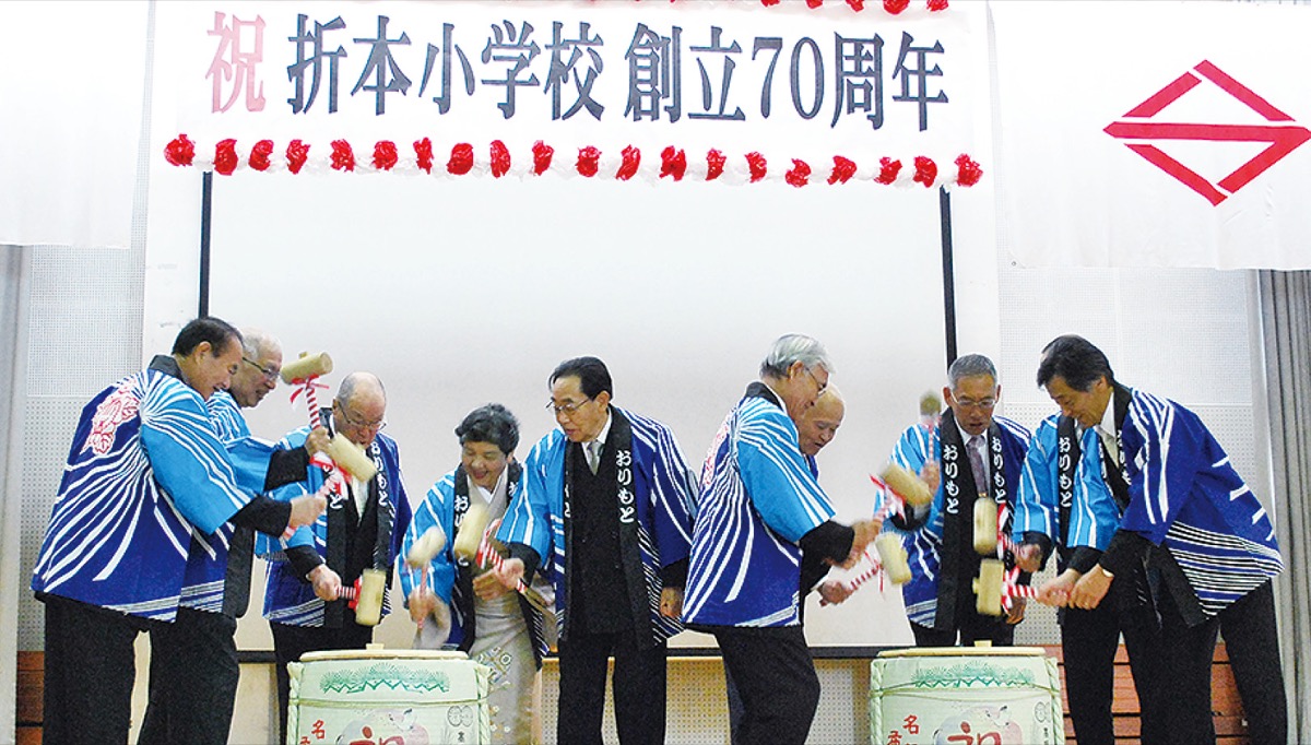 折本小学校の変遷は明治時代まで遡る。50周年記念誌によると、1873年(明治6年)に折本学舎が真照寺に設置されていたという。その後、現在の交差点「東方町」付近に折本小が創立され、東方・折本・川向・大熊の4地区のこどもが通っていたが、1916年(大正5年)に一度、廃校になる。