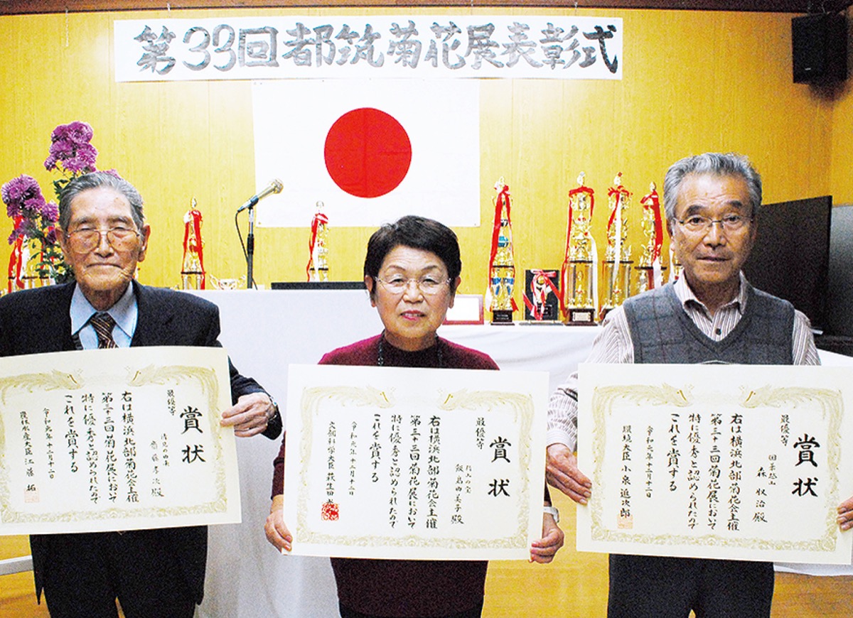 横浜北部菊花会(近藤記一会長)主催の第33回都筑菊花展表彰式が12月12日、佐江戸会館で行われた。