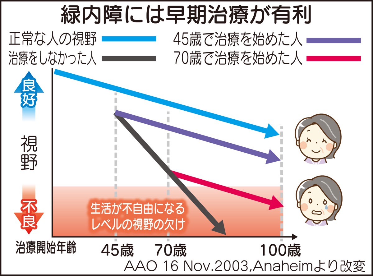 特に緑内障は日本人の失明率第1位。視野が狭くなってきたと実感できるレベルでは、症状がだいぶ進行しています。これまでは「失った視野は戻らない」と言われていた緑内障ですが、21世紀に入り、これまではなかった眼圧を下げる新薬が登場。現在は6種も開発されています。また、OCTと呼ばれる5分ほどで終わる目の写真を撮るような検査機器も登場し早期発覚ならば助かる時代に。特にOCTは一度の検査で目に関する大量の情報が入手できるので他の病気も見つけることができます。上のグラフは治療開始年齢による緑内障の進行度合いを表した一例です。同じ緑内障患者でも目の機能が若いうちに治療を開始した45歳は100歳になっても視野を維持していますが、70歳で開始した人はその後、生活に不自由なレベルまで視野が悪化しました。OCT検査は保険適用で約600円なので40歳以上の人は検診を勧めます。