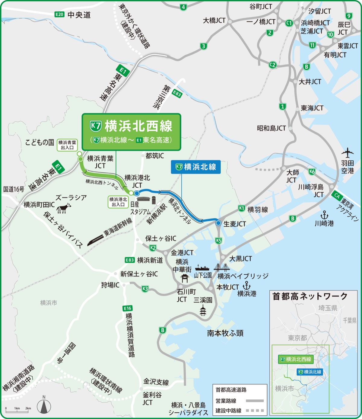 2017年3月に開通した横浜北線(第三京浜道路・横浜港北ジャンクション※以下JCTから首都高横羽線・生麦JCT)と直結する路線として、東名高速道路・横浜青葉JCTと第三京浜道路・横浜港北JCT間を結ぶ、延長約7・1Km(内トンネル部約4・1Km)の便利な路線だ。