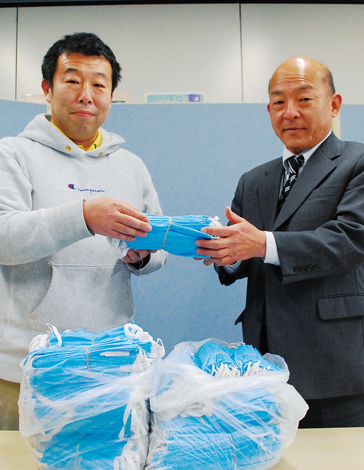 早渕に横浜支社を構える(株)運動会屋が14日、区社会福祉協議会善意銀行へマスク1000枚を寄付した。運動会屋の谷裕之取締役は「(コロナの状況下)マスクで地域に恩返しができれば」とし、同会の半田博之事務局長は感謝を述べた上で「高齢者施設等で使用予定です」と話した。