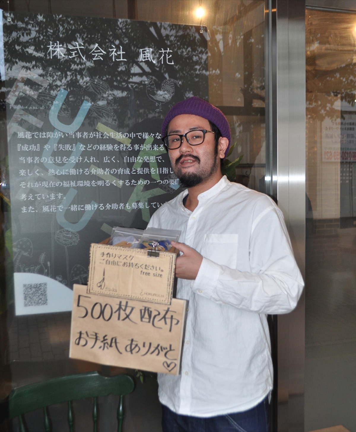 障害者の介護者派遣やバリアフリーの推進活動を行う株式会社風花(大丸)では同施設で働くヘルパーらが手作りしたマスクの無料配布を行っている。