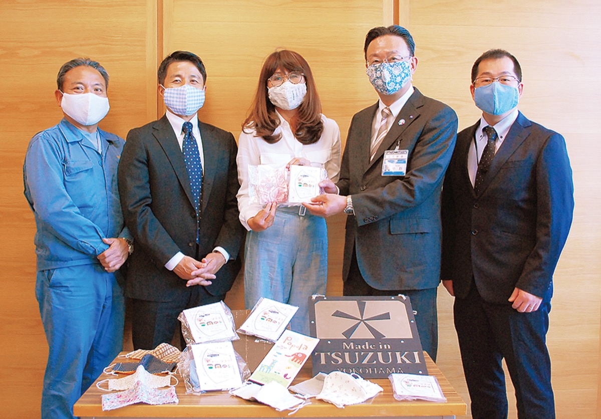 都筑区の中小製造業などで結成されている「メイドインつづき」の有志メンバーとNPO法人こども応援ネットワーク理事長の佐藤洋子さんらが5月8日、都筑区役所を訪れ、手作りの布マスク300枚を寄贈した。