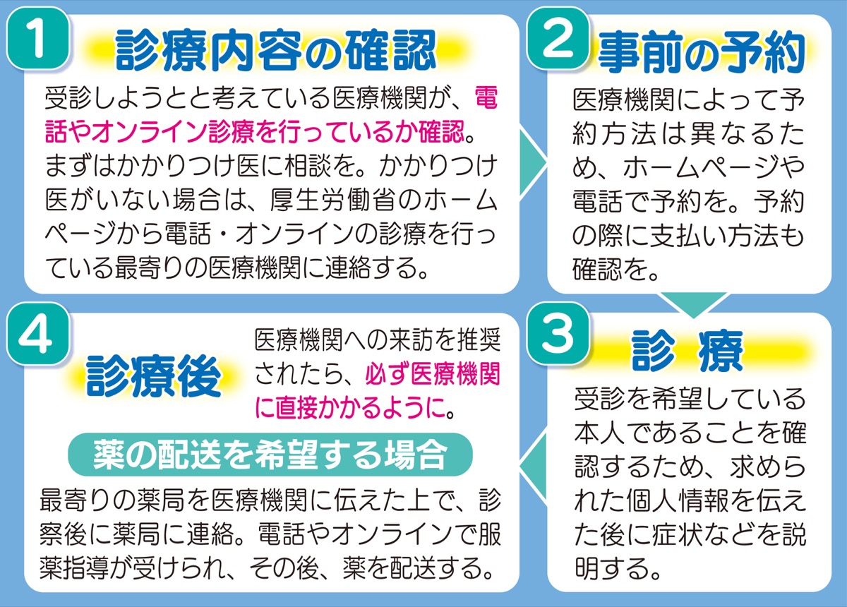 オンライン診療を希望する人はまず、受診しようと考えている医療機関のホームページを確認するか、直接医療機関に電話やオンラインの診療を行っているかを確認を。