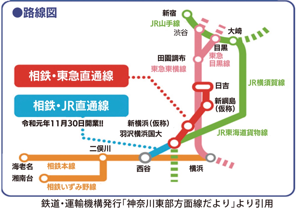 この路線は、昨年11月に開通した、相鉄・JR直通線の羽沢横浜国大駅から新横浜駅を経由し、東急東横線・目黒線日吉駅までの10Km区間で、相鉄線と東急線の相互直通運転が可能となる。新幹線アクセスの向上、JR東海道線などの既設路線の混雑緩和や乗り換え回数の減少などが期待されている。