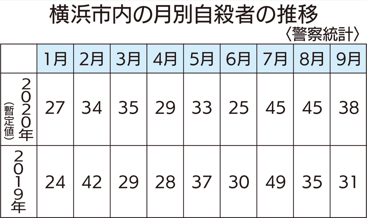 全国的に夏以降の自殺者増が報じられているが、横浜市でも8・9月は対前年同月比でプラス計17人で増加傾向にあることがわかった(警察統計暫定値)。中でも若年層の割合増が目立つ。市は国の状況を踏まえつつ、引き続き留意が必要としている。