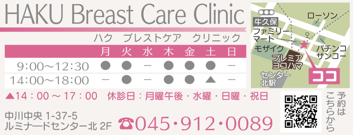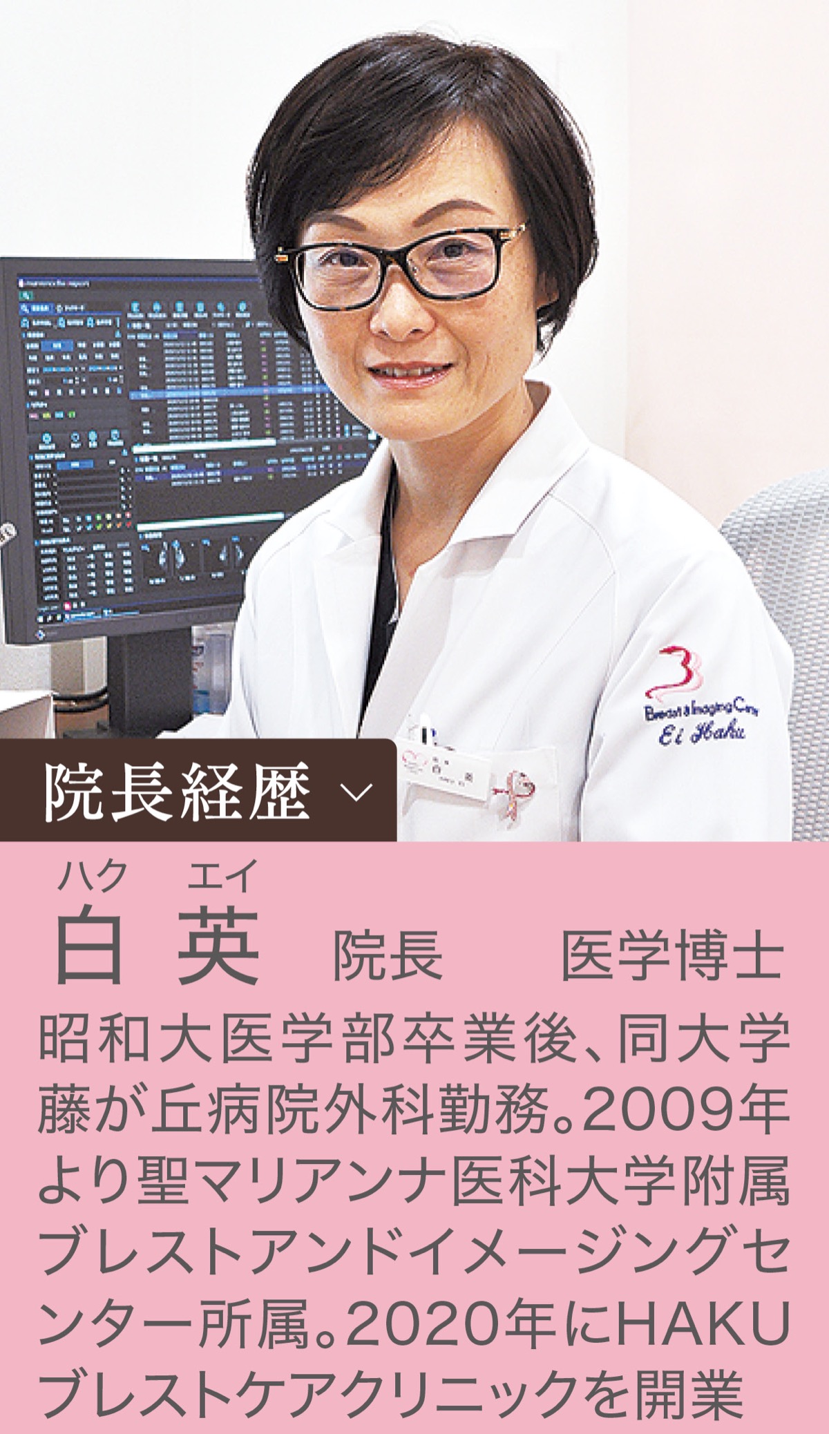 同院では、白院長が乳がんの診断はじめ乳房に起こる病気の専門的な検査や横浜市乳がん検診、乳腺ドッグ(自費)、乳がん術後の補助療法、定期検査を行う。
