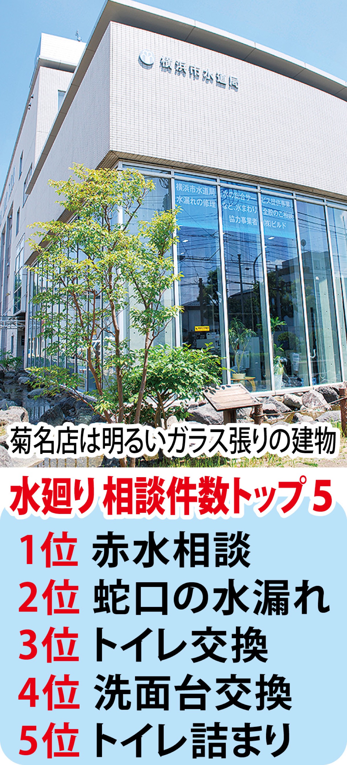 地域密着型ホームドクターとして横浜市緑区上山に本社を置く創業37年の(株)ビルドは、横浜市上下水道工事指定工事店として水廻りの修理や工事に長年取り組んできた。4月からは市水道局「菊名ウォータープラザ」に店舗を構え、約半年間に多数の市民からの相談や修理依頼を受けてきた。