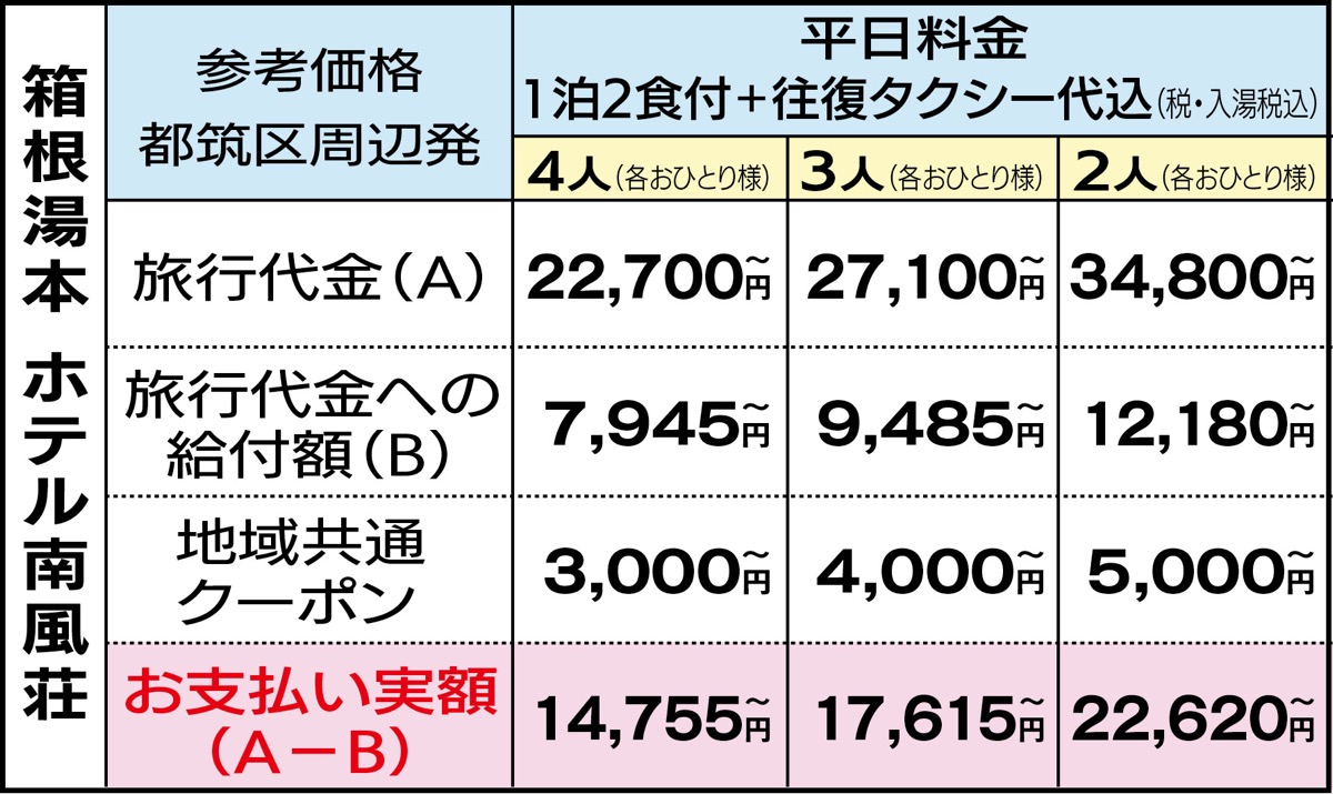 このプランは自宅から宿泊先までの往復をタクシーで移動する宿泊付ツアー。宿泊先は、箱根湯本、湯河原、熱海、山中湖、石和、木更津の7つのホテルから選べる。