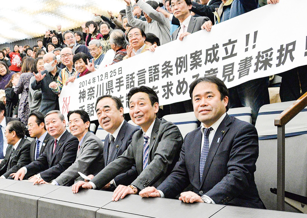 2014年12月、県議会は、鳥取県に次いで全国2例目、議員提案としては全国初となる手話言語条例を制定いたしました。これは、日常的に「手話」をコミュニケーション手段として使用されている方々の当事者団体である神奈川県聴覚障害者連盟より、約5万5000筆超の署名とともに条例制定を求める陳情が提出されたことを受け、県議会内に設置した検討チームで議論を重ね、制定されました。