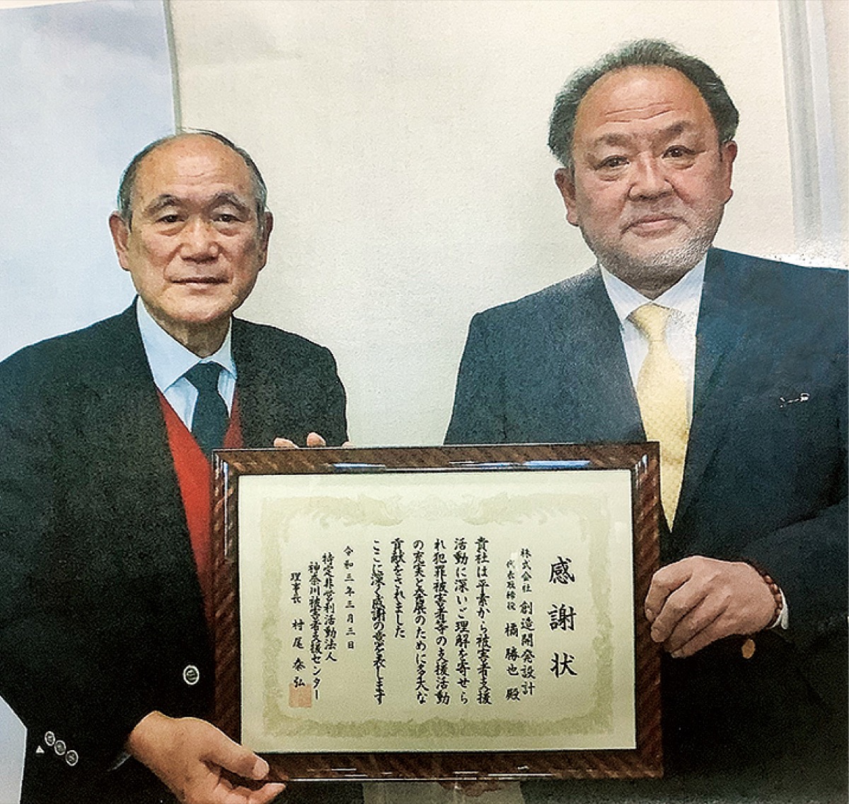 区内中川中央にある総合建設業の(株)創造開発設計(橘勝也代表取締役)がこのほど、NPO法人神奈川被害者支援センター(村尾泰弘理事長)に金一封の寄付を行い、同理事長から感謝状を受け取った。橘代表は「犯罪被害者の救済のために少しでも役に立てれば」と話した。