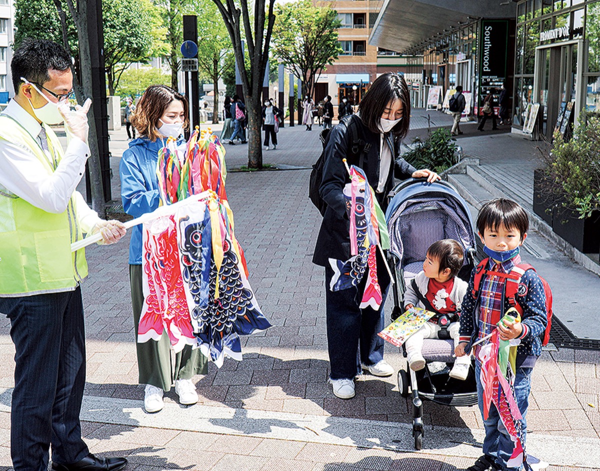 今年は手持ちの鯉のぼりでこどもの日をそれぞれ楽しんで--。センター南商業地区振興会(金子進会長)が8日、センター南駅近くのすきっぷ広場で子どもたちに鯉のぼりを配布した。手に取った親子に笑顔が広がった。